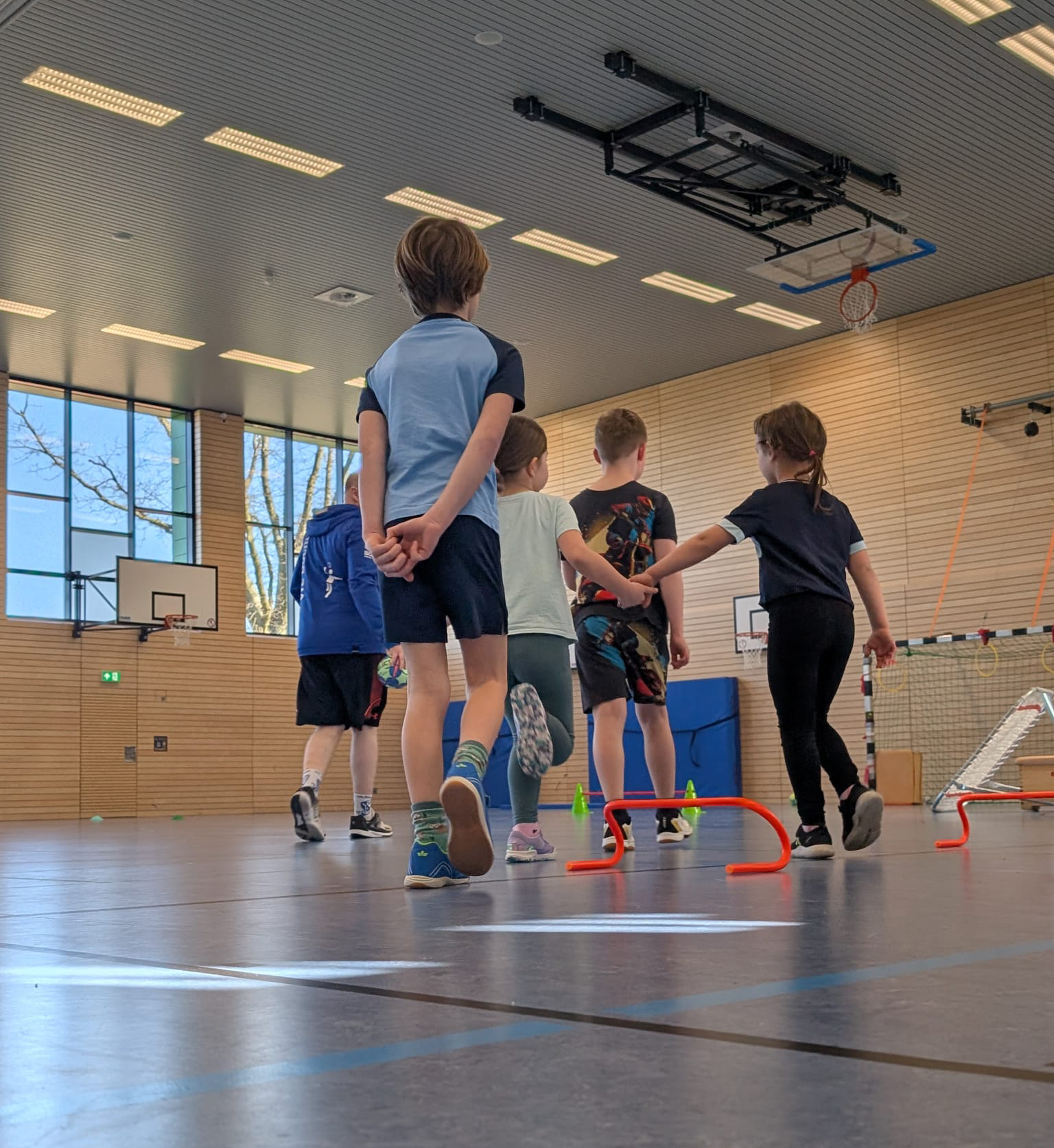 In einer hellen Sporthalle spielen mehrere Kinder Handball. Die Kinder tragen sportliche Kleidung und sind aktiv beim Spiel oder Übung. Die Halle hat große Fenster, die Tageslicht hereinlassen, und Holzwände mit Basketballkörben. Einige Sportgeräte sind auf dem Boden sichtbar, darunter Trainingshürden.