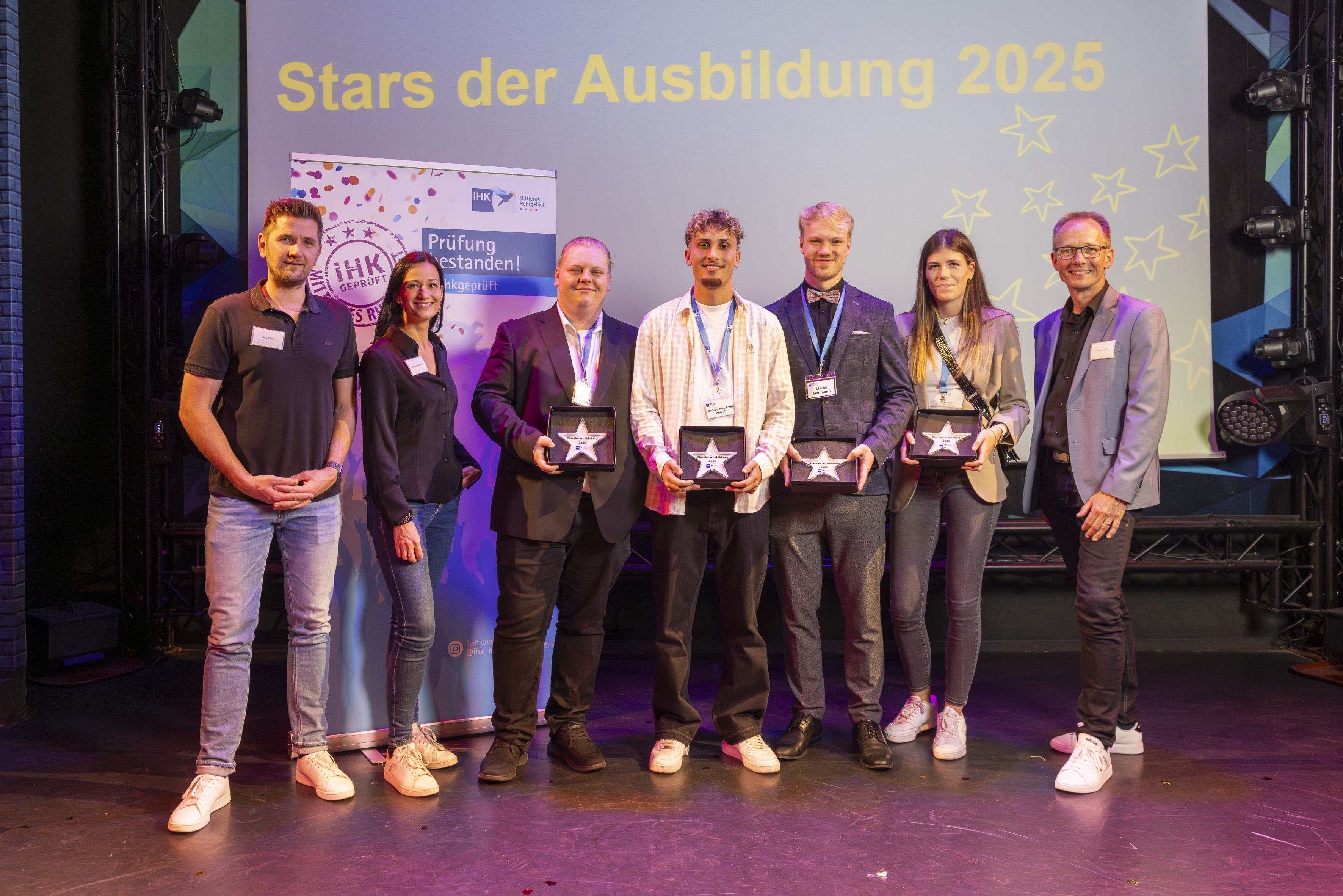 v.l. Stadtwerke-Ausbilder Marc Kaiser und Ausbildungsleiterin Naira Gammersbach mit den Stadtwerke- Absolvent*innen Anthony Schug, Muhammed-Emin Aydinli, Marco Baumann, Lia Trockel und Stadtwerke-Geschäftsführer Holger Rost. Auf dem Bild fehlt Absolvent Tobias Klanke) Foto: Sascha Kreklau